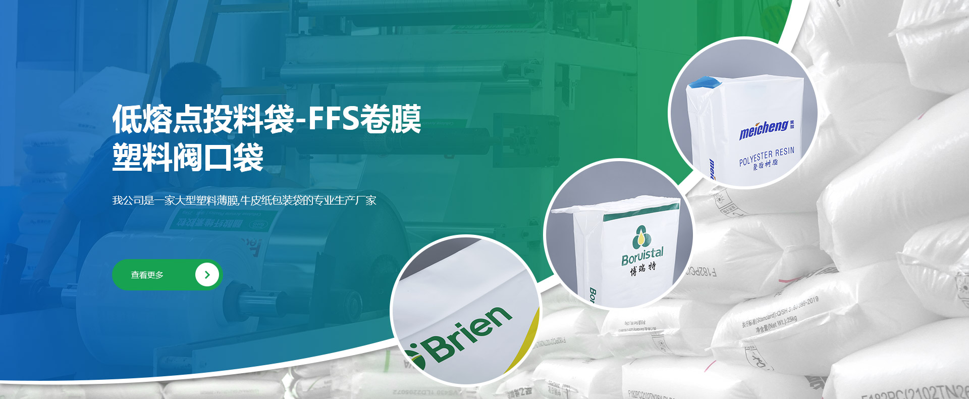 我公司是一家大型集塑料薄膜類、牛皮紙類產(chǎn)品研發(fā)、生產(chǎn)和銷售的專業(yè)廠家,公司產(chǎn)品大量出口國(guó)外。海陽(yáng)市融昌塑編包裝有限公司創(chuàng)建于1998年,是專業(yè)研發(fā)、生產(chǎn)和銷售低熔點(diǎn)橡膠投料袋、EVA閥口袋、LDPE多層閥口袋、EVA/LDPE低熔點(diǎn)膜、橡膠包裝膜、FFS重包裝袋、普通塑料包裝袋、牛皮紙閥口袋等產(chǎn)品的綜合包裝類企業(yè)。公司坐落于中國(guó).山東省煙臺(tái)海陽(yáng)市,地處黃海之濱,位于青島、煙臺(tái)、威海三市的中心地帶,交通發(fā)達(dá)占地面積35000㎡,固定資產(chǎn)8000萬...